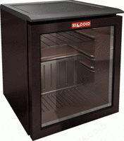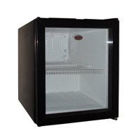 Черный холодильник компрессорного типа со стеклянной дверцей. Температура внутри холодильника от 5C до 10C. Размеры холодильника (В*Ш*Г): 52.5*44*47 см.